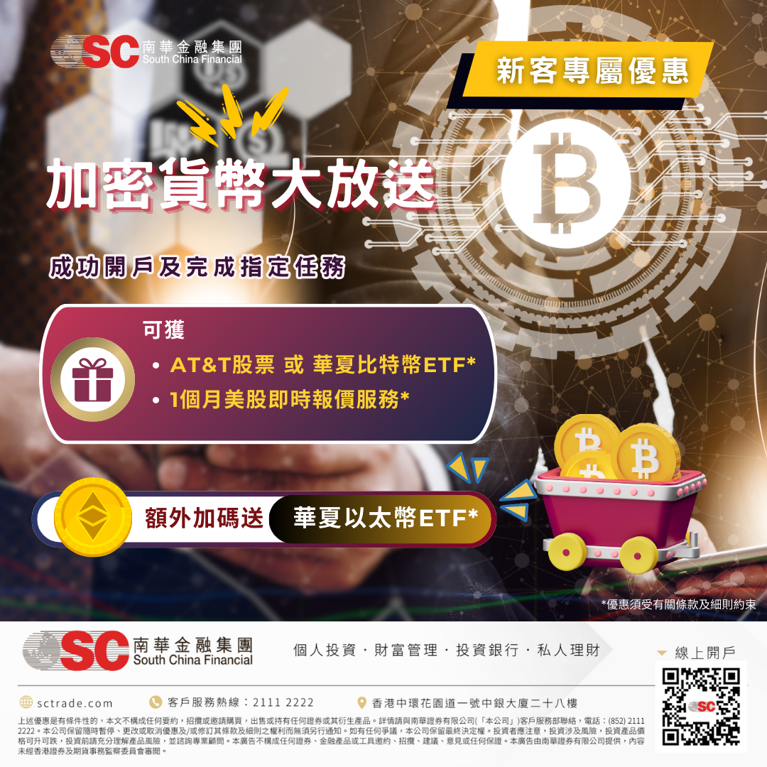 2. 新客戶於優惠期內成功開立南華證券股票帳口,並在優惠期於存入港幣$10,000元正或以上(該資金須維持30日或以上),可獲贈送1) 1股AT&T (股票代碼T.US)或16股華夏比特幣ETF (股票代碼3042.HK) ,及2) 16股華夏以太幣ETF (股票代碼3046.HK),同時獲贈1個月美股即時報價服務。